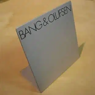Small Bang & Olufsen Desk/Shelf standing advertising plate. Finished in Brushed Aluminium with the wording “Bang & Olufsen”