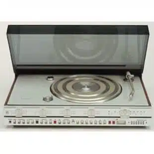 A light indicator assisted accurate tuning and an illuminated meter registered the signal strength of a station. The FM section was extremely sensitive (better than 1.4 uV I.E.C.) and harmonic distortion was a mere 0.4%. Field effect transistors, ceramic filters and integrated circuits were used. The built-in record-player was perfectly matched to the rest of the unit, from a specification point of view. The fitted pickup cartridge, the SP 10A (later SP 12A) had a spherical naked diamond and a stylus pressure of 1.2 grams. Frequency range was 20 – 25000 Hz ± 3 dB and distortion was lower than 1%. Wow and flutter was less than 0.09% and rumble was better than 60 dB.