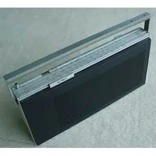 The sandwich construction consists of two plastic trays that can be removed in order to change batteries. They click into place on the aluminium frame. The plastic had a special velvety texture, a rough effect exuding quality. The model in black resembles charcoal. A smart detail is in the handle which can be tipped to one side as a support so that the radio can conveniently lie obliquely with the controls in front of you or on your work desk. After one of B&Oโs factory buildings burned down, one of the employees happened to switch on a Beolit that had completely melted down and it played quite happily in spite of it all! โ taken from โJacob Jensenโ by Christain Holmsted Olesen.