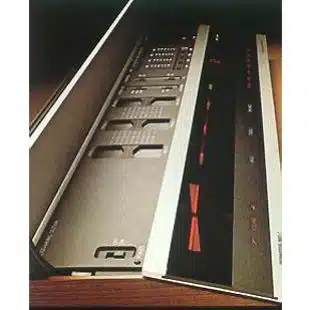 A headphone connection was provided beneath the front edge of the unit. Controls not needed every day were situated beneath a hinged lid. These included tone and balance adjustment, FM pre-setting, loudness, AFC and MONO/STEREO switches, and a switch for selecting a basic initial volume level. This facility allowed you to choose the volume at which the amplifier began to play each time it was switch on – no matter how controls were left the previous time. On its primary control panel Beomaster 2400 had no knobs or buttons. The panel functioned electronically and needed only the contact of your finger to activate it. However, the ultrasonic remote control would have proved more useful. The set’s sophisticated indicator system would tell you instantly that your commands had been obeyed.