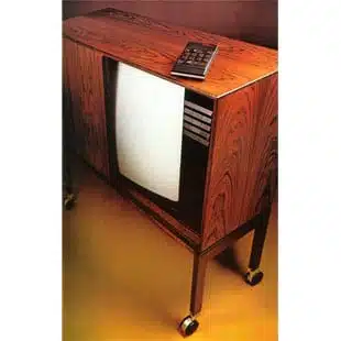 Beovision 6002’s genuine wood-finished cabinet had a unique tambour screen door for protecting the screen when the set was not in use. The self-styled wooden undercarriage with smooth-running castors was both practical and elegant.